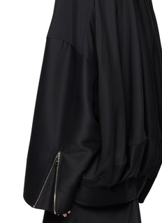 Structured yet fluid, this jacket by R2W is crafted from a smooth wool-silk blend that drapes with understated ease. The high neckline and relaxed volume lend a modern, cocooned silhouette, ideal for layering over slip dresses or pared-back tailoring.