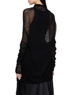 Refined and quietly sensual, this top showcases R2W's mastery of contemporary. Finely ribbed with a semi-sheer finish, it offers elongated sleeves that gather with subtle texture and depth—an elegant layering piece that moves seamlessly from polished daytime looks to intimate evening styling.