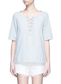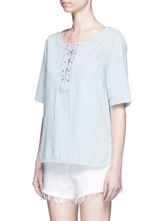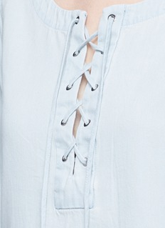rag & bone/JEAN的单品以极简设计为主,是不少女生的日常必备单品。这款上衣采用纯棉面料打造,经过洗漂处理,呈现柔和的浅蓝色调。大圆领及交叉系带设计,让您透出一份休闲的妩媚气息。