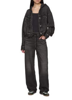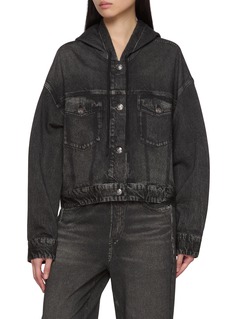 Blending the ease of a hoodie with the structure of a denim trucker, this jacket reimagines off-duty dressing with a cool, washed-black illusion. Soft cotton terry creates a cocooning feel, while the relaxed cut and tonal drawcords lend a subtly streetwise edge—perfect for weekend layers or monochrome styling.