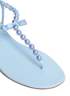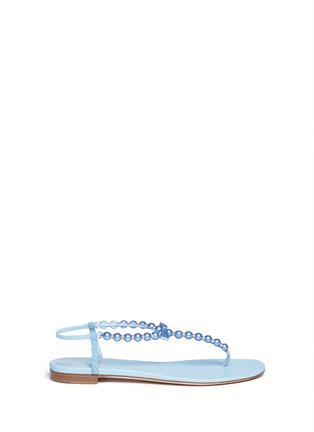 芮妮乔薇拉将其对精致奢华鞋履执着追求融合到每一双鞋履的设计中,设计师深谙如何极尽女性化的细节和令人窒息的华美珠饰以表现高贵气质。同时又将不同颜色和多种材质的宝石组合变换,每一双芮妮乔薇拉的设计都令人赞不绝口,无法拒绝。这双凉鞋的设计采用淡雅的粉紫色俘虏少女们的芳心,仿佛脚尖生出的奢华,提升了整体着装的华丽美感。同色系的珍珠装饰与缎面蝴蝶结从细节处体现穿着者的超凡品味,轻易成为人群焦点,瞬间惊艳全场。