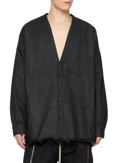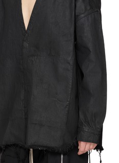 The Lido Larry Shirt from Rick Owens DRKSHDW redefines edgy versatility with its bold, deconstructed design. Crafted in black, this statement piece features a raw, frayed hem and can be worn traditionally or slung over the shoulder using the back strap for a dramatic, avant-garde look. Perfect for those who embrace fearless style and architectural silhouettes.