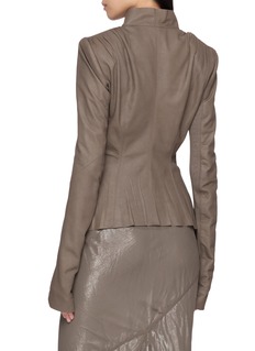 Rick Owens 解构西装语言,这件夹克采用轻柔皮革打造,围裹式剪裁与腰侧系带勾勒线条,深 V 领型弱化凌厉感,呈现暗黑美学中的柔焦质感。搭配同色系金属光泽半裙,构建层次丰富的极简造型。