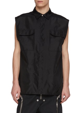 Rick Owens 以工装为灵感,将无袖廓形注入暗黑美学。这件外搭衬衫选用挺括的尼龙帆布,双胸袋与肩部织带强化了功能性细节,宽松剪裁与不对称下摆则释放出不羁气场。单穿或叠搭长袖内搭,都能呈现品牌标志性的先锋姿态。