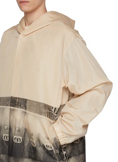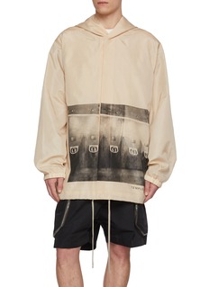 这件连帽夹克是 Rick Owens 对 “wearable art” 的诠释:轻盈的尼龙帆布保证了户外实用性,而正面的印花则注入了强烈的亚文化叙事。它既能作为造型的视觉核心,也能为极简穿搭增添层次。