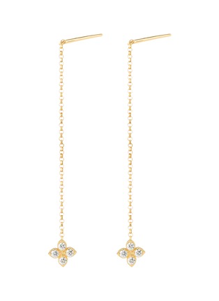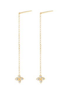 This drop earring from Roberto Coin’s Princess Flower collection captures timeless elegance with its delicate 18k gold flower motif. Adorned with sparkling diamonds and a touch of ruby, the design exudes femininity and sophistication. The dangling chain adds movement, making it a refined yet playful statement for any occasion.