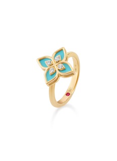This ring from Roberto Coin’s Princess Flower collection is a masterpiece of colour and craftsmanship, featuring 18k gold petals adorned with sparkling diamonds and ruby. The vibrant blue ceramic enamel adds a modern twist, creating a striking contrast that highlights the floral motif.