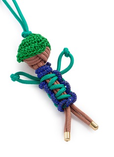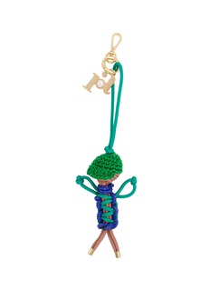 This enchanting Rosantica bag charm brings a playful and artisanal touch to your accessory collection. The charm features a whimsical figure adorned with a vibrant green knitted cap and a textured body in shades of blue and green, meticulously crafted for a striking visual impact.