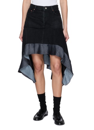 sacai 善于打破常规,制造惊喜,将各种材质、色彩、廓形巧妙糅合,颠覆传统时装美学。这款牛仔裙以褶裥设计结合不对称下摆,勾勒灵动线条。