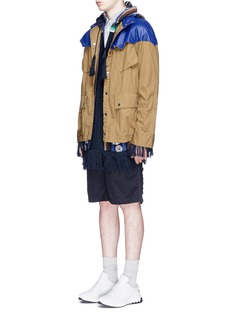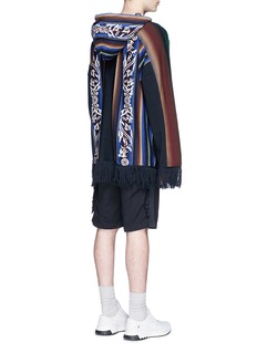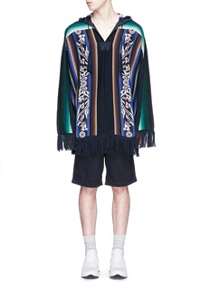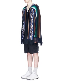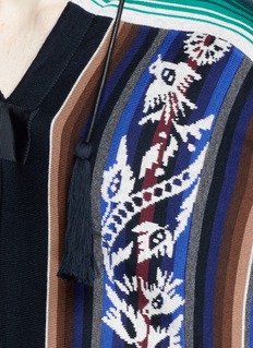 sacai这款针织上衣为造型注入浓郁的民族气息,缤纷色彩衬托细条纹图案,构成优美的渐变效果,搭配民族图案独树一帜,袖口及下摆均加上密集的流苏点缀,透出一份自由不羁的随性格调。