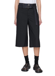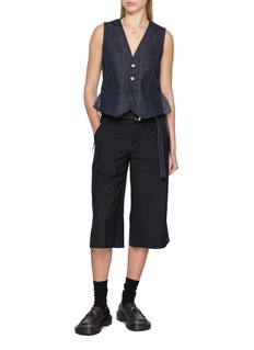 sacai 善于打破常规,制造惊喜,将各种材质、色彩、廓形巧妙糅合,颠覆传统时装美学。这款阔腿裤采用丹宁与西装面料拼接,质地挺括且富有层次。腰带设计增添结构感,在细节间散发雅致格调。
