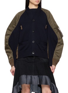 This sacai cardigan reworks utilitarian codes through a refined lens, blending a soft knit body with sleek nylon raglan sleeves. The contrast in texture and tone creates depth and function, offering a modern layering piece that balances structure with understated ease.