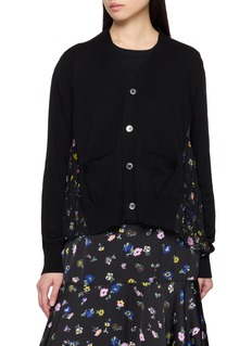 A refined expression of sacai’s hybrid language, this cardigan pairs a clean cotton knit front with fluid floral panels unfolding at the sides and back. The contrast adds soft movement—perfect layered over dresses or styled with tailoring from day to evening.