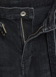 This sacai jeans redefines utilitarian style with its oversized, baggy silhouette and adjustable belted waist, blending functional details with avant-garde comfort. The dark wash denim and relaxed fit create a bold, contemporary statement for modern wardrobes.