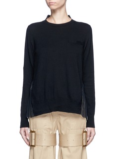 sacai的设计中经常呈现熟练的拼接技巧,此款上衣以柔软的棉混羊绒针织面料为基础,正面纯色感觉低调,一转身即呈现鲜明的黑白色波点、字母及斜纹图案,配以标志性的半立领及百褶设计,打造出独一无二的不对称效果。