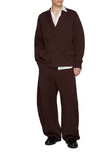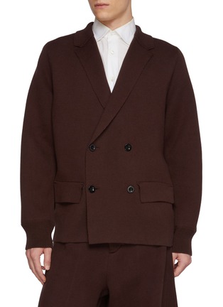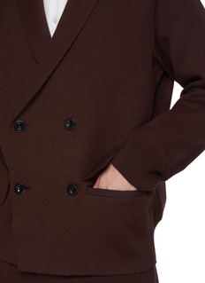 Tailoring meets knitwear in this sacai blazer, where a softly structured cotton-cash knit redefines classic double-breasted form. Ribbed trims temper the sharp lines with ease, making it an elegant layer for modern workdays or refined weekend styling.