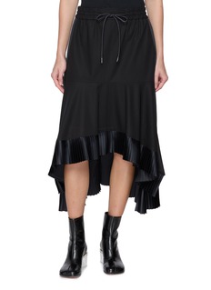 sacai 善于打破常规,制造惊喜,将各种材质、色彩、廓形巧妙糅合,颠覆传统时装美学。这款半身裙以褶裥拼接融入不对称下摆设计,勾勒灵动线条,增添摩登层次感。