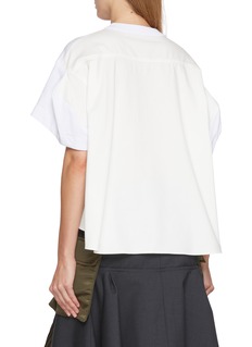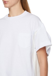 This sacai T-shirt redefines casual elegance with its hybrid fabric construction, blending the softness of jersey with the structure of denim. The oversized silhouette and dropped shoulders create a relaxed, avant-garde fit, while the flared short sleeves add a playful, deconstructed touch.