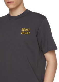 sacai’s graphic language takes a poetic turn in this short-sleeve tee, where embroidered text and hand-drawn imagery unfold with quiet intent. Crafted in soft cotton jersey, it grounds expressive styling when paired with tailored trousers or layered beneath knits for everyday ease.