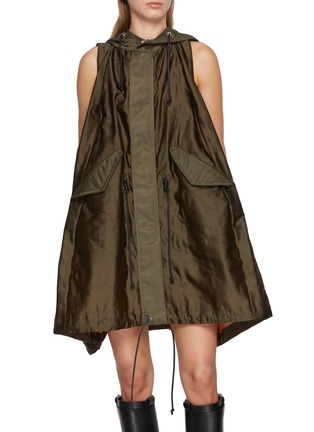 This vest merges functional design with avant-garde flair, featuring a sleeveless, tent-like silhouette and multiple pockets for a utilitarian edge. The lightweight fabric and drawstring hood offer both style and practicality, making it a bold statement for modern, innovative dressing.