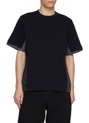A study in sacai’s hybrid construction, this T-shirt pairs smooth cotton jersey with denim panel detailing at the sides for subtle contrast. The minimalist front is grounded by a classic pocket, creating an everyday essential with quiet structural depth and modern balance.