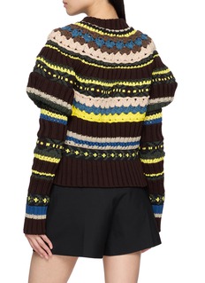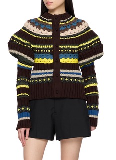 A tactile celebration of craft, this sacai cardigan layers rich Fair Isle patterns with sculptural Juliet sleeves for a quietly dramatic silhouette. The high neckline and buttoned front lend structure, while the intricate knit brings warmth and character—an expressive layer for refined everyday dressing.