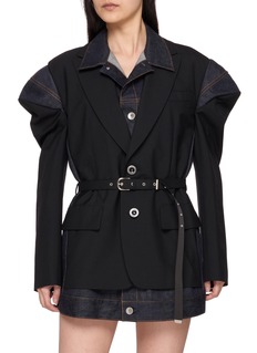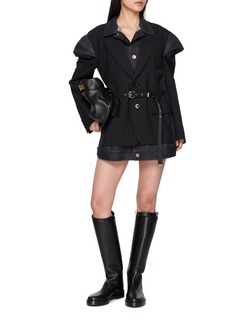 sacai 善于打破常规,制造惊喜,将各种材质、色彩、廓形巧妙糅合,颠覆传统时装美学。这款外套以西装与牛仔拼接打破边界,泡泡肩型衬出轮廓,配腰带收束腰身。搭简约皮靴,带来街头酷帅步伐。