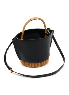 Sacai reimagines the classic basket bag in a luxurious raffia-and-leather blend, with a sleek round base and signature gold-tone logo handle. Equipped with a removable shoulder strap, a roomy open interior, and a detachable leather pouch for organized elegance, this Italian-made piece balances textural artistry with modern practicality—an iconic addition to curated wardrobes.