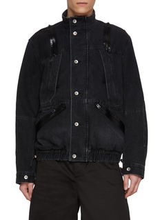 This dark-wash denim jacket channels sacai’s hybrid sensibility through a structured yet oversized silhouette. Leather-trimmed accents and sleeve zippers introduce a utilitarian edge, while the elevated neckline sharpens the profile, offering a directional outer layer designed for layered, urban styling.