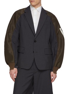 This blazer articulates sacai’s hybrid tailoring through contrast and proportion. Structured poly-wool suiting forms a sharp, composed body, while oversized nylon sleeves introduce utilitarian volume and texture. The result is a deliberate tension between refinement and function, ideal for directional, modern styling.