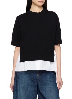 sacai 善于打破常规,制造惊喜,将各种材质、色彩、廓形巧妙糅合,颠覆传统时装美学。这款上衣巧用条纹衬衫面料和柔软针织面料剪裁拼接,打破日常沉闷,勾勒层次廓形。