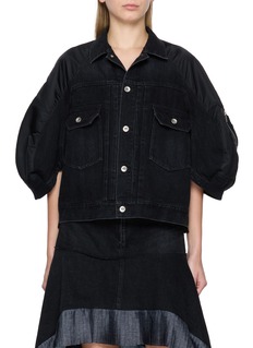 This sacai jacket exemplifies a masterful blend of utility and contemporary style, featuring a timeless black palette for a utilitarian flair. Crafted in a relaxed fit, it includes a button up front and flap pockets, enhancing both functionality and aesthetic appeal.