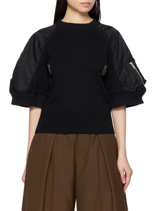 A sculptural take on everyday knitwear, this sacai top contrasts a smooth cotton-blend knit body with voluminous nylon puff sleeves. Utility details nod to MA-1 codes, lending a subtle edge to the refined silhouette—an elevated piece for modern, layered city dressing.