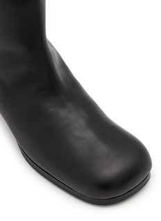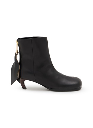 Sacai reimagines classic ankle boots with signature hybrid design, featuring a sculptural cylindrical heel and distinctive branded tag detail with hardware accent. The streamlined silhouette with rounded toe and clean lines delivers understated elegance, while the architectural heel structure showcases the brand's innovative approach to contemporary footwear.