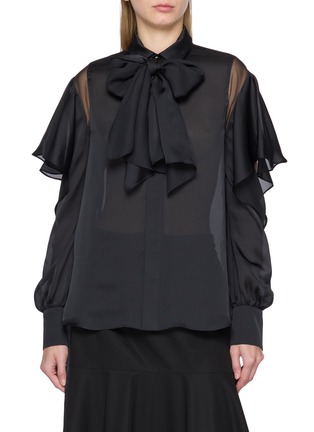 sacai 善于打破常规,制造惊喜,将各种材质、色彩、廓形巧妙糅合,颠覆传统时装美学。这款衬衫采用缎面与雪纺拼接,质感轻盈柔滑。荷叶边结合蝴蝶结系带,勾勒优雅柔美的线条。