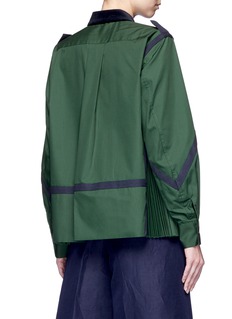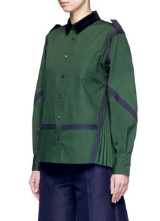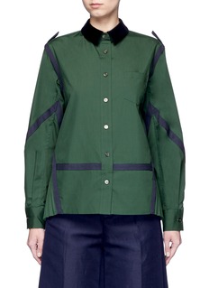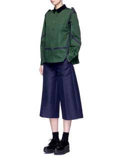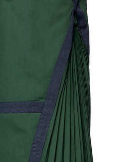 sacai以品牌的前卫手法改造基本款衬衫,整体以军绿色调展现帅气风范,深蓝色绒面领及条纹装饰注入摩登格调。衣摆两侧拼接标志性的百褶面料,让廓形更加充盈,营造立体效果。您可以搭配宽松下装,演绎独特魅力。