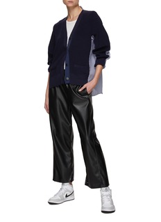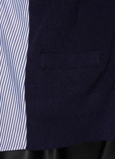 sacai 以其混合拼接设计而闻名,这款针织开衫背后拼接条纹衬衫式设计,散发出悠闲的魅力。海军蓝与蓝白条纹柔和相配,为您的日常装束增添清新气息。