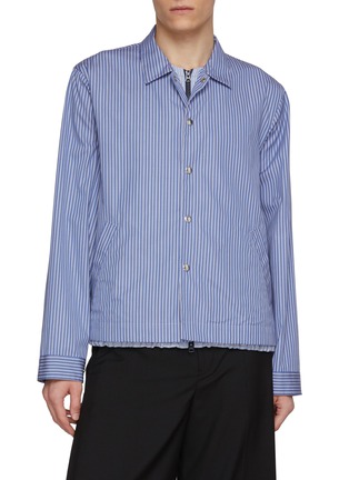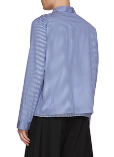 Defined by crisp vertical stripes, this shirt jacket channels sacai’s signature layering through a subtly exposed hem and hybrid construction. The clean poplin base is offset by tailored ease, making it an effortless choice for polished everyday styling or light transitional layering.