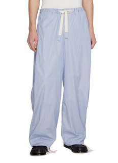 A study in sacai’s signature hybridity, these pants fuse shirting-inspired cotton poplin with a relaxed, modern silhouette. Vertical stripes elongate the leg, while the elasticated drawstring waist brings ease to everyday styling—ideal with crisp shirts or sculptural knits for polished off-duty moments.