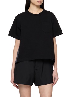sacai 善于打破常规,制造惊喜,将各种材质、色彩、廓形巧妙糅合,颠覆传统时装美学。这款 T 恤采用双面料拼接带来个性层次,立体廓形打破基础款的沉闷。