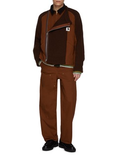 sacai's collaboration with Carhartt WIP redefines utilitarian style, merging the rugged functionality of Carhartt's iconic duck fabric jackets with sacai’s innovative design elements. Boasting a hybrid design with contrasting fabric, this jacket exudes an avant-garde take on winter essentials.
