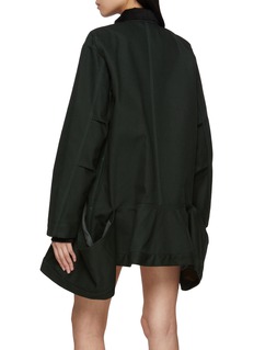 Workwear codes meet feminine volume in this collaborative dress coat by sacai and Carhartt WIP. Rendered in deep green duck canvas, its bonded finish holds a sculptural flare, turning a utility staple into an unexpected statement for both layering and standalone wear.