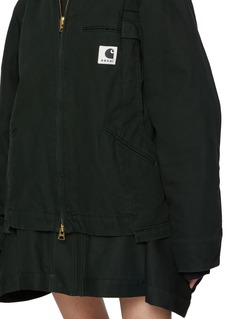 为了创造出扎根于实用主义服装的风格,sacai 与 Carhartt WIP 合作,将其耐磨、实用的风格和面料与 sacai 独特的设计语言相结合,重新解构工装元素。这款夹克以标志性下笔不规则拼接廓形融入挺阔面料,搭配口袋与金属细节,为经典工装格调注入俏皮气质。