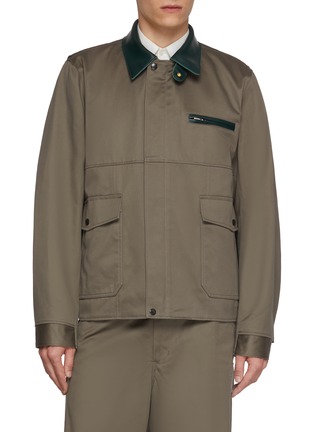 Blending utilitarian structure with refined contrast, this jacket embodies sacai’s signature hybrid language. Crisp cotton chino is elevated with a smooth leather collar and trims, creating a sharp, modern layer that transitions seamlessly from city dressing to contemporary tailoring.