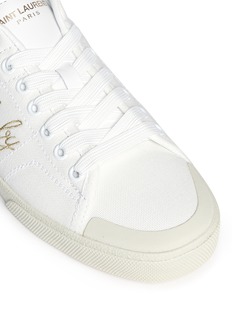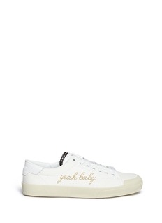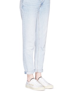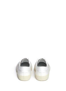 Saint Laurent此款迎合了近季街头大热的白球鞋热潮,白色帆布与真皮相拼接,鞋舌处加入黑色真皮拼贴及标志性的银色小铆钉点缀,低调地展示了品牌朋克摩登的风格,为休闲款式增添前卫气息。