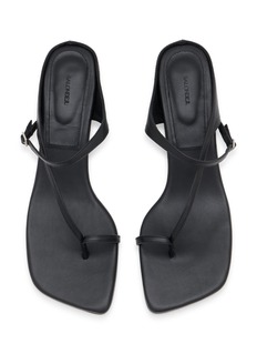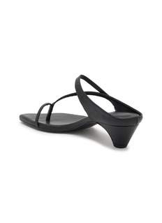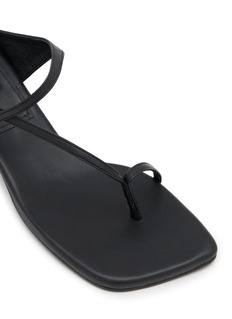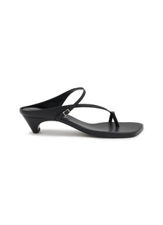 Salondeju presents sculptural kitten-heel sandals with asymmetric toe-ring straps and minimalist slingback design for contemporary architectural styling. The streamlined silhouette with modest conical heel and adjustable ankle fastening delivers refined elegance, while tonal monochrome finish and avant-garde construction create a distinctive essential for sophisticated warm-weather dressing with modern edge.