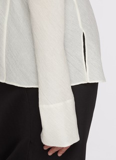 SANDBEIGE 结合现代极简主义与经典优雅的设计理念,强调简洁、知性的美学,灵感来源广泛,从历史上的著名设计师到自然界的奇妙色彩。这款衬衫用肌理材质强化质感,高领细节添保暖性,宽松廓形平衡舒适与精致。