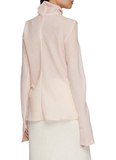 SANDBEIGE 结合现代极简主义与经典优雅的设计理念,强调简洁、知性的美学,灵感来源广泛,从历史上的著名设计师到自然界的奇妙色彩。这款衬衫用肌理材质强化质感,高领细节添保暖性,宽松廓形平衡舒适与精致。