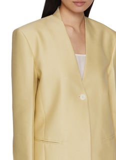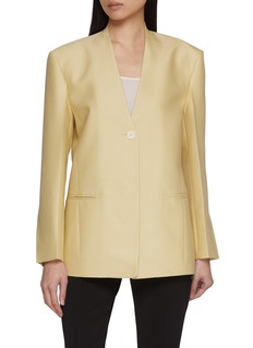 SANDBEIGE 结合现代极简主义与经典优雅的设计理念,强调简洁、知性的美学,灵感来源广泛,从历史上的著名设计师到自然界的奇妙色彩。这款西装用缎面材质强化柔美感,V 领细节添休闲氛围,宽松廓形平衡随性与精致,是衣橱里兼具质感与实穿的单品。