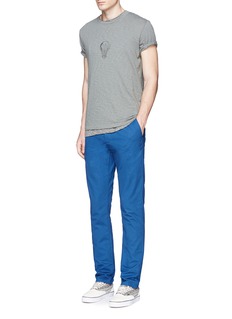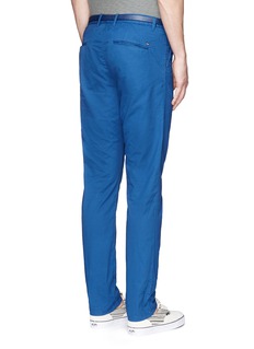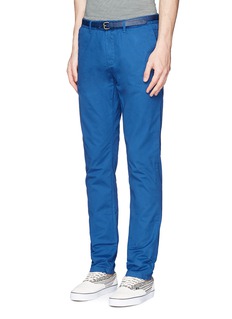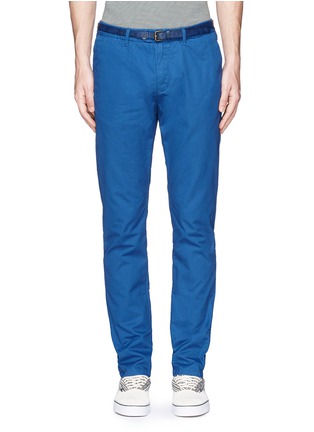 苏格兰苏打这款斜纹布裤剪裁简洁利落,合身版型展示男士的笔直双腿,附带一条深蓝色皮革腰带,为蓝色设计画龙点睛,彰显您自信醒目的一面。